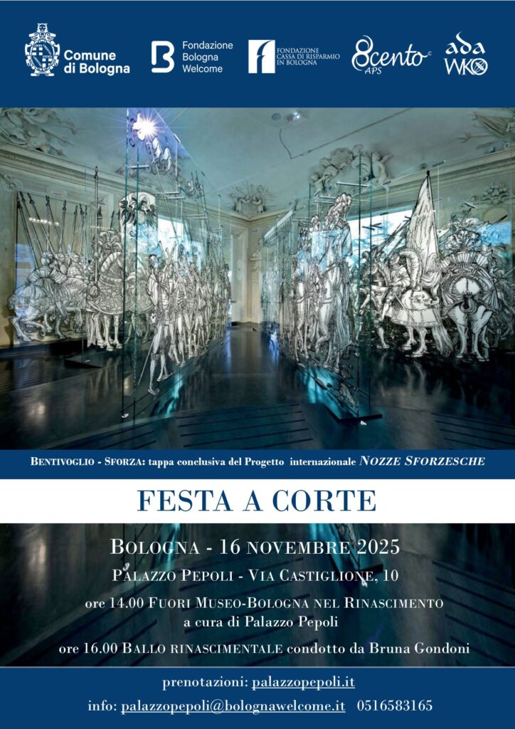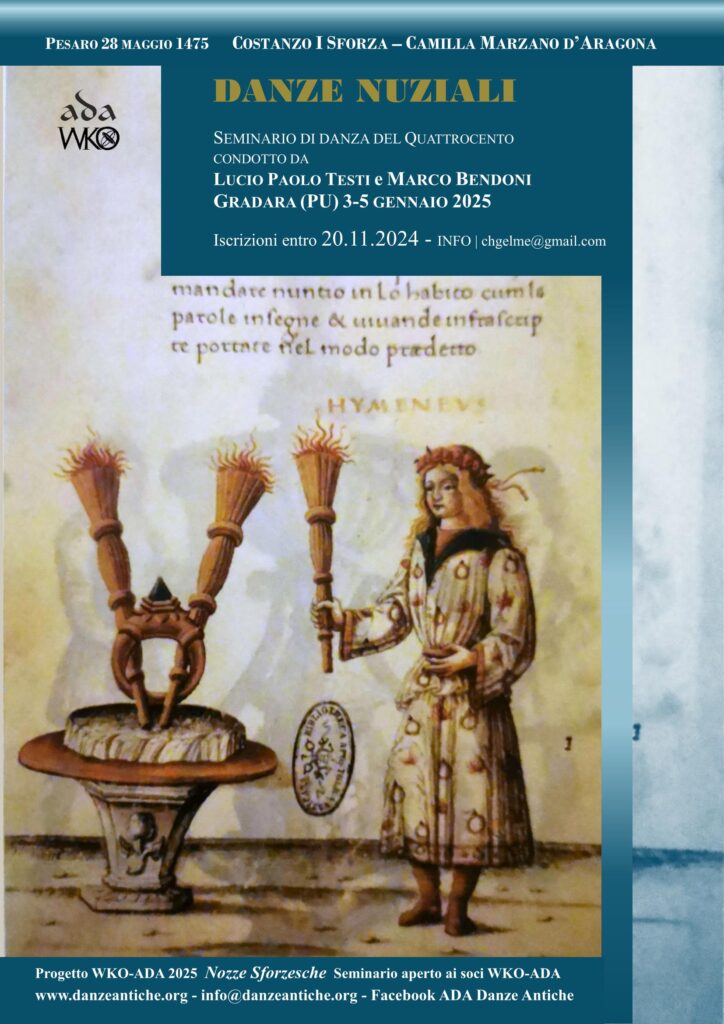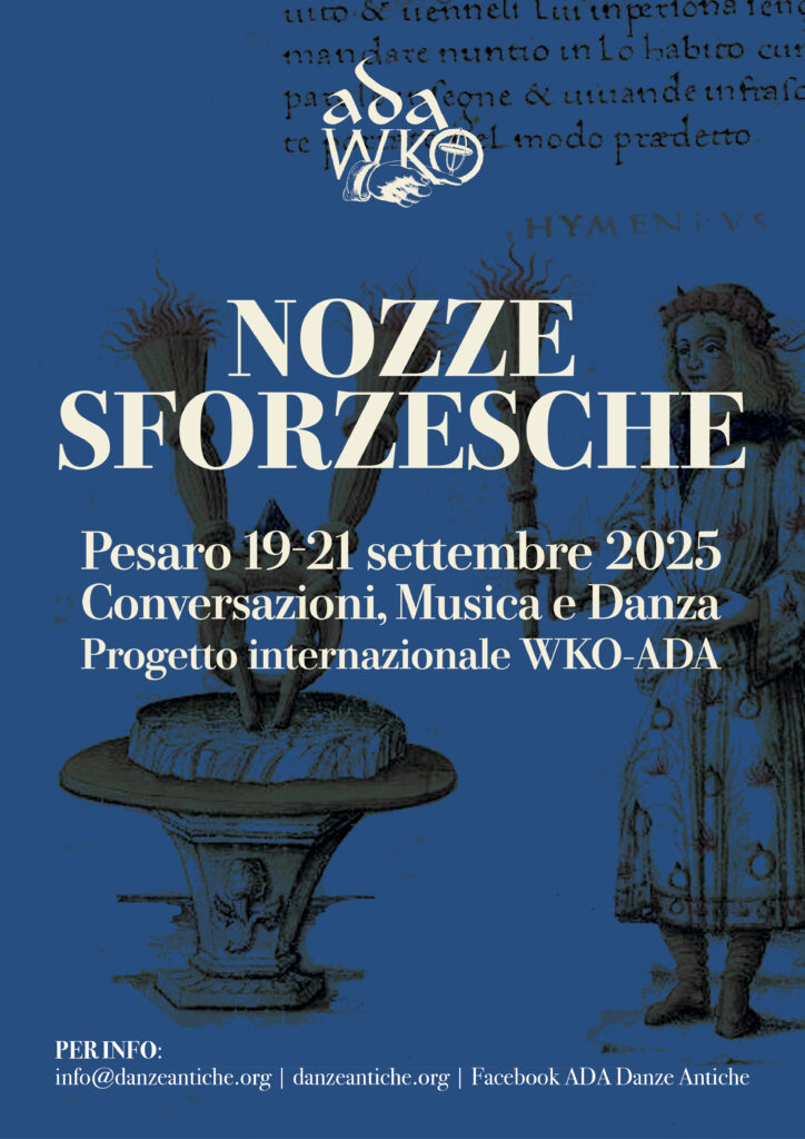 BALLO RINASCIMENTALE condotto da BRUNA GONDONI a conclusione del progetto WKO-ADA NOZZE SFORZESCHE – BOLOGNA. PALAZZO PEPOLI, 16 NOVEMBRE 2025, ORE 16:00 Aperto ai gruppi di danza storica previa iscrizione, scaricabile qui sotto e inviando la richiesta di iscrizione via mail a info@danzeantiche.org entro il 15 ottobre 2025;