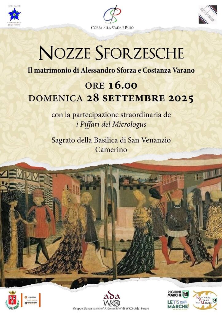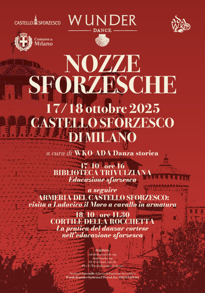 La famiglia Sforza, attraverso le unioni matrimoniali, prassi comune tra le nobili e importanti famiglie dell’epoca, ha mirato a tessere nuovi rapporti tra corti o a rinsaldarne altri, costruendo basi fiduciarie di appoggio, in un contesto territoriale complesso e scosso da guerre per la supremazia. Non solo la politica matrimoniale avvenne tra le corti della stessa penisola, ma si espanse alle casate delle potenze straniere, cercando appoggi parentali importanti che l’unione nuziale, in suolo italico o fuori da questo, poteva loro dare. Molteplici quindi le nozze sforzesche con il regno d’Aragona di Napoli ed emblematici i tentativi di Ludovico il Moro con la nipote Bianca Maria, prima promessa al trono di Ungheria e poi all’Asburgo e col proprio figlio Massimiliano, per il quale, quando aveva appena tre anni, aveva combinato il suo matrimonio con Maria Tudor, figlia di re Enrico VII d’Inghilterra, sorella minore del futuro Enrico VIII, matrimonio che poi non ebbe luogo. Così come il precedente progetto WKO-ADA Il Viaggio di Ippolita del 2022 ci ha insegnato, riunire attorno a un percorso tematico le diverse realtà territoriali che si occupano della formazione e diffusione della danza storicamente informata, è un arricchimento per chi le fruisce e per chi le propone. Non perdere la memoria del nostro passato, sollevarne il velo attraverso la riattualizzazione e la proposta di studio di queste discipline artistiche cosiddette minori, come la danza storica, è anche, fin dalla costituzione associativa. il nostro obiettivo. L’arte, minore o maggiore, è tale se la si può condividere, con chi l’apprezza e chi ancora non la conosce; l’anelito artistico sospinge l’atto creativo a rendersi manifesto, in dialogo con le altre discipline che lo incorniciano, affiancano o accompagnano. E un corpo danzante è in cerca di scambio comunicativo. Dialogo muto, eppur risonante, riverberante, che porge le parole tracciate nel corpo, dal corpo, vibrante tra terra e cielo. Il progetto Nozze sforzesche ci permette di lavorare vicini e lontani, tessendo un lungo e colorato intreccio di amicizia, di conoscenza e studio, di ricerca e di scambio culturale e poietico. Porgendo, in ogni luogo qui prescelto, un tassello di piccola grande storia.